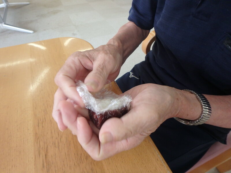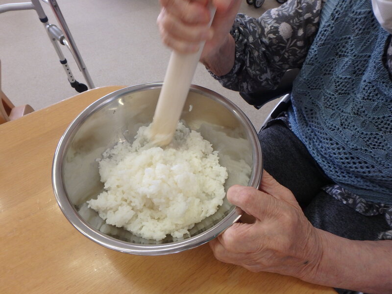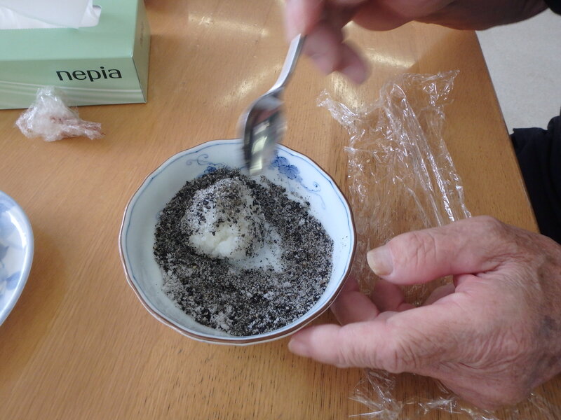 軟らかめに蒸かしたご飯を利用者さんに潰していただき、食べやすい大きさに丸めてあんことごまで包んだら、淹れたてのお茶と一緒にいざ実食!