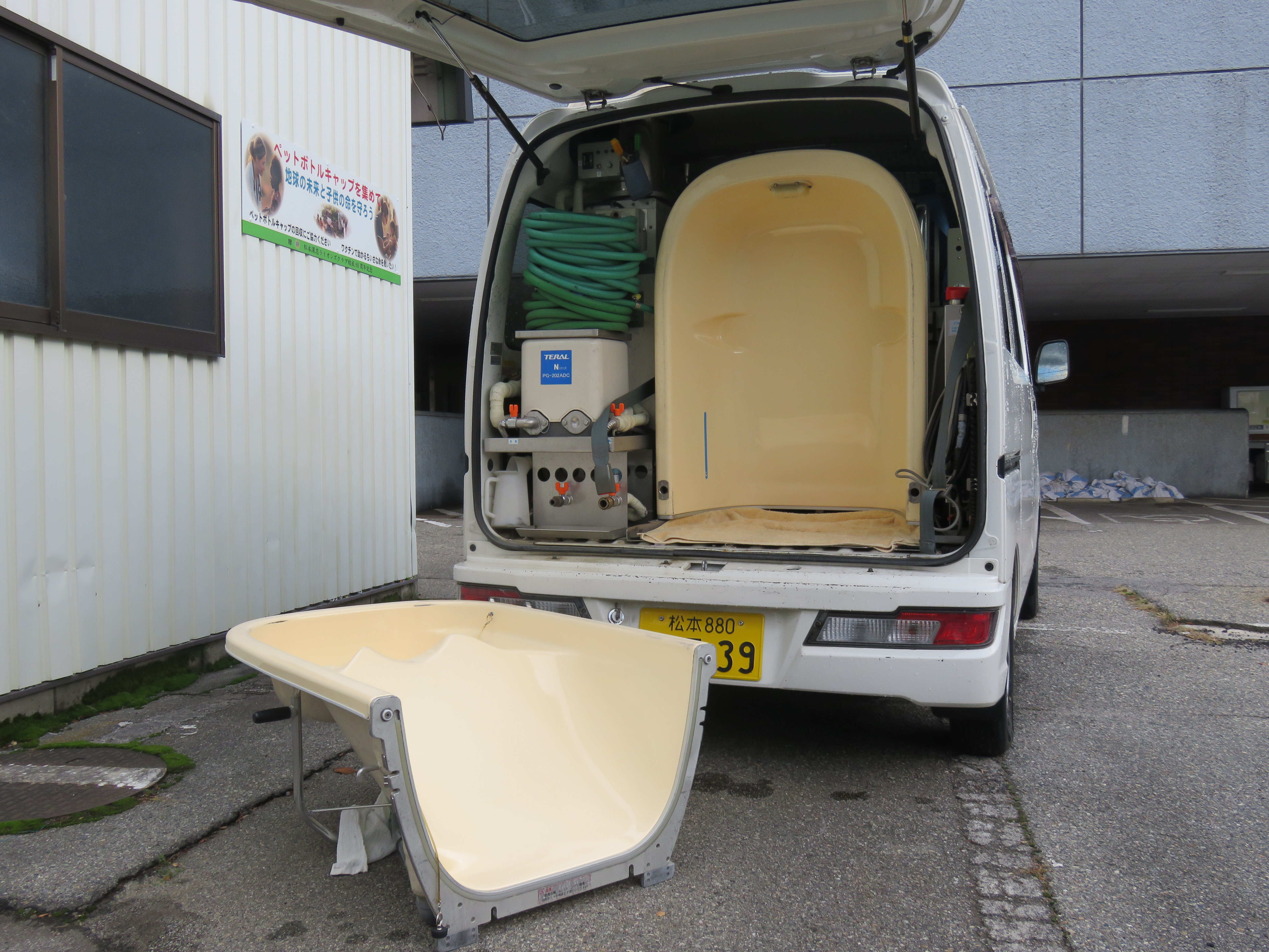 そのどれもが2分割の浴槽を載せた軽ワゴン車になっています。