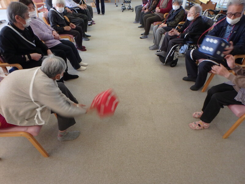 バトンリレーと玉入れは運動会の定番という事で白熱した勝負になり、ここでは利用者さんも大真面目。リレーの時は椅子から立って足踏みをされる方もいらっしゃいました。