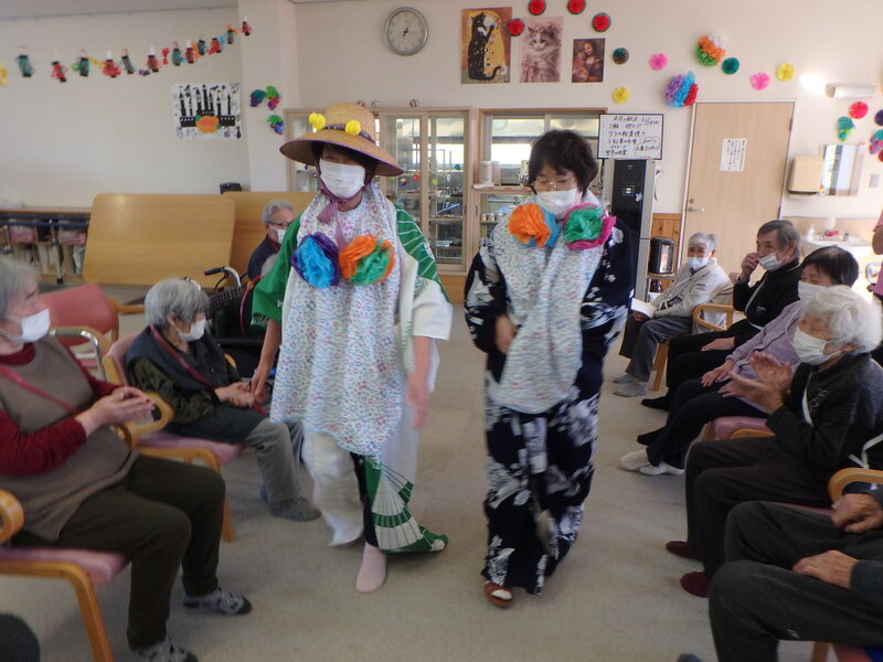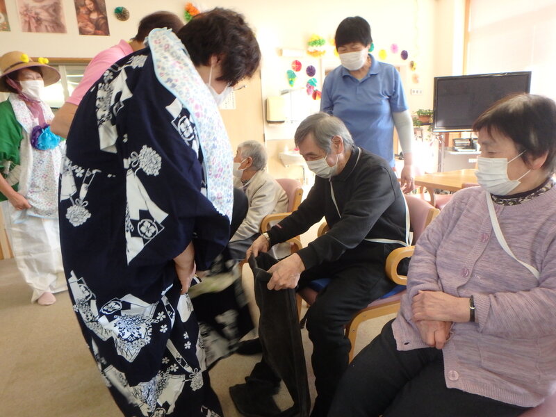 ちょっと拝借では皆さんにくじを引いていただき、紙に書いてあるものをカゴから探して職員を着飾ってもらいました。浴衣やもんぺ、麦わら帽子にお花等...今回は職員が利用者さんに着せてもらい何だか新鮮でした。